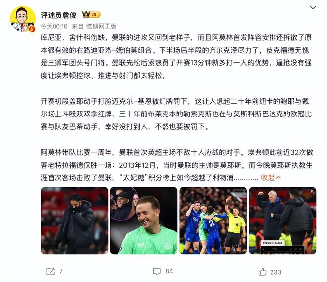 赛后,著名的足球评论员詹俊在社交媒体上发文,对曼联的表现进行了一番点评。他写道:“库尼亚、舍什科伤缺,曼联的进攻又回到老样子,而且阿莫林首发阵容安排还拆散了原本很有效的右路迪亚洛-姆伯莫组合。下半场后半段的齐尔克泽尽力了,皮克福德无愧是三狮军团头号门将。曼联先松后紧浪费了开赛13分钟就多打一人的优势,逼抢没有强度让埃弗顿控球、推进与射门都太轻松。”